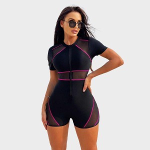- Product Name: Black Mesh Fabric Patchwork Zipper Short-Sleeved One-Piece Flat-Front Swimsuit Fashionable and Sexy One-Piece Surfing Swimsuit
