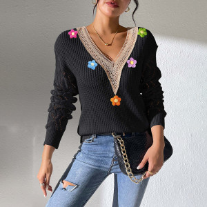 - Product Name: Lace V-neck pullover sweater casual and fashionable sweater hand-knitted patchwork floral base layer sweater