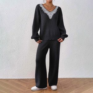 - Product Name: Women's woolen set sweater casual and fashionable sweater V-neck loose top + solid-colored wide-leg straight-leg pants sweater set